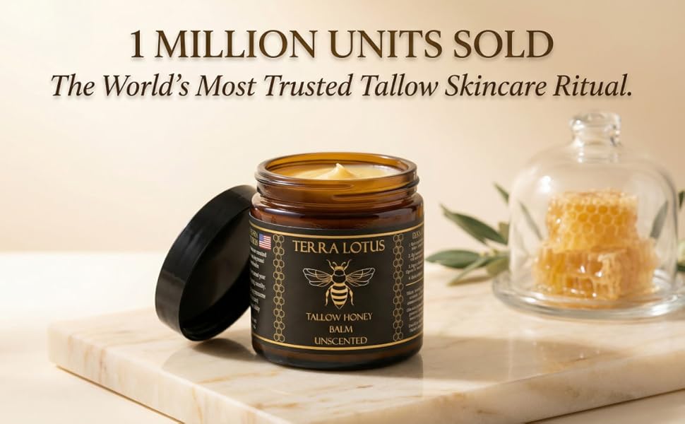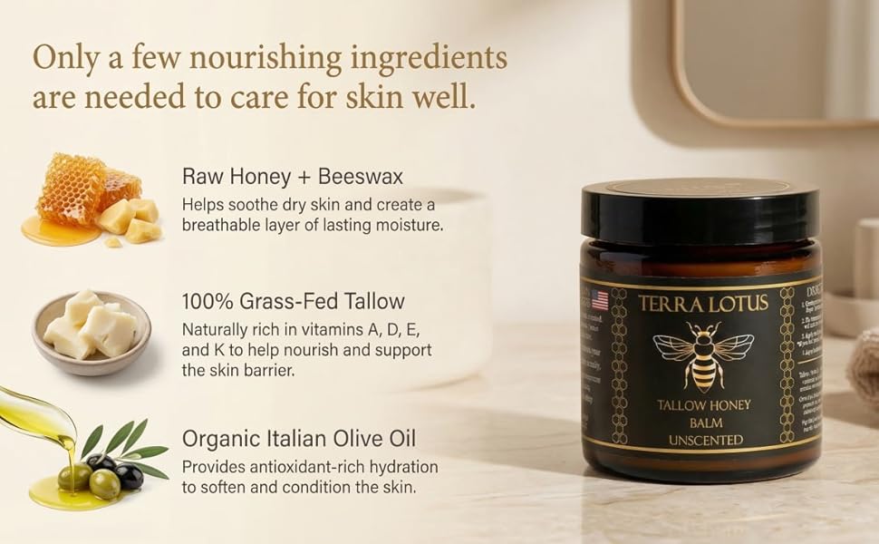 It’s a natural, nutrient-rich skincare balm crafted with 100% grass-fed organic beef tallow as the core ingredient, blended with organic Italian olive oil, raw honey and citrus essential oils. It’s a chemical-free moisturizer designed to nourish, hydrate and repair the skin, and is a best-selling product from Terra Lotus, made in the USA with small-batch production for premium quality.